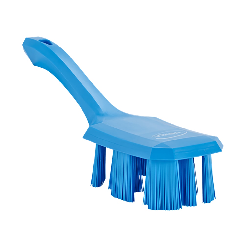 This Vikan hand brush is a blue, short-handled brush ideal for cleaning conveyor belts, machinery, and food-preparation surfaces in high-risk areas. It has stiff polyester bristles and angled Filament Security Units to reduce contamination and bristle loss. Constructed from polypropylene and glass-reinforced polyester (PBT), this brush meets FDA and EU food safety standards.