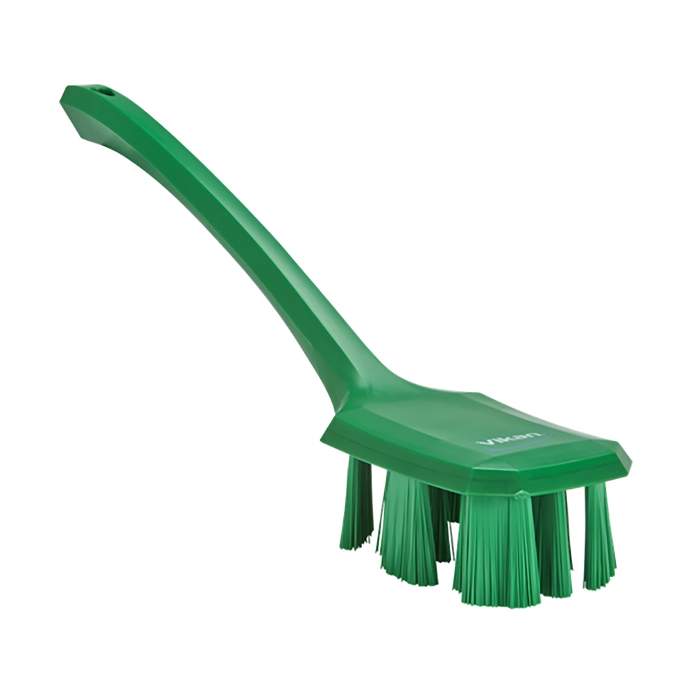 This Vikan long-handled hand brush is designed for optimal cleaning in high-risk areas. Featuring Ultra Safe Technology (UST), this brush has stiff, green polyester bristles secured by angled Filament Security Units to minimize contamination and bristle loss. Its durable polypropylene construction ensures long-lasting use, making it ideal for cleaning machines, buckets, containers, and tubs. The ergonomic handle provides a comfortable grip, reducing hand fatigue during extended cleaning sessions. This brush is compliant with FDA regulations and various food contact material standards, making it suitable for hygiene-sensitive environments.