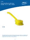 This Vikan washing brush is a yellow, long-handled brush designed for cleaning hard-to-reach surfaces on machines and equipment such as deep buckets, containers, and tubs. It features stiff, angled bristles that enhance cleaning efficacy by removing stubborn dirt and grime. Made from durable materials like polypropylene, polyester (PBT), and stainless steel (AISI 304L), this brush complies with FDA and EU food safety regulations.